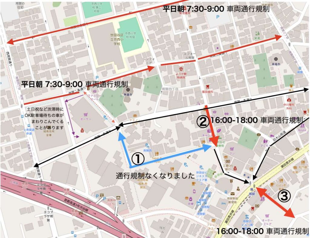 ・ 道路標識を理解していない外国人運転の車は多いです。世田谷以外のナンバーの車が通行禁止時間帯にまちがえて走ることも多いです。しかし世田谷ナンバーの車でもルールを理解していない運転手はいます